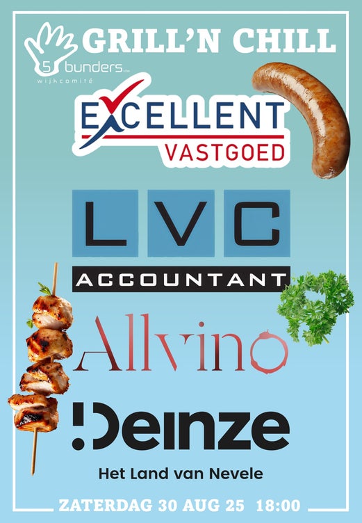Kom dan op zaterdag 30 augustus 2025 om 18u00 naar Grill 'N Chill, het smakelijkste evenement van het jaar georganiseerd door Vijfbunders vzw!